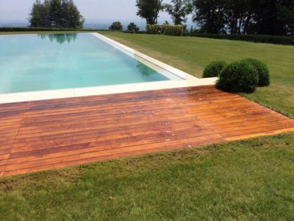 I rivestimenti per esterno in legno, grazie al calore del materiale e alla resa estetica vengono utilizzati sempre più spesso per pavimentare i bordi piscina, come in questa lussuosa abitazione in provincia di Torino dove abbiamo fornito e posato un decking in Teak Burma, un legno che duraturo, resistente all'acqua, agli agenti atmosferici e alle escursioni termiche.